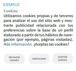 En este sentido, podríamos establecer un sistema por capas. En la primera capa se ofrecerá la información esencial de las cookies (definición, función, tipo de cookies, finalidad y el modo en el que se puedan aceptar, rechazar o configurar dichas cookies.) y en la segunda una información más detallada, utilizando, por ejemplo, el término “Cookies”, “Política de cookies” o “Más información, pulsa aquí”.